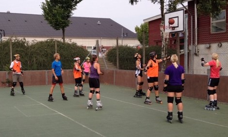 Her er jeg på højskole, og vi er ved at lære at køre på inliners – det er ret svært at lære som voksen, (synes jeg), men når der er en bold med som i dette tilfælde, bliver det hele meget lettere og sjovere. Man glemmer hjulene på fødderne, for man leger jo – bolden skal op i nettet for det gælder jo om æren ved at vinde, hvis man spiller et spil.